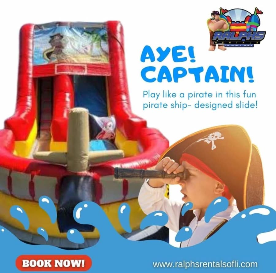 Ahoy, mateys! Get ready for an adventure like no other with our 18' Pirate Ship Themed Water Slide from Ralphs Rentals of Long Island! This incredible inflatable is perfect for thrill-seekers and pirate lovers of all ages. Whether you're hosting a birthday party, school event, summer bash, or community festival, this water slide will be the highlight of your event!