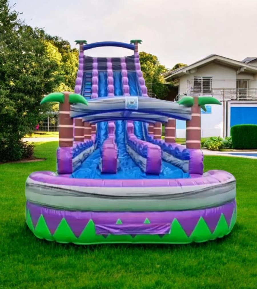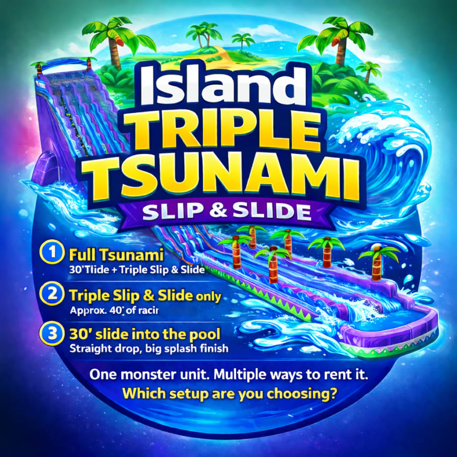 Why settle for 2 lanes when you can have THREE? Ralph's Rentals is proud to bring you the Island Tsunami Triple Lane—the largest and most exciting water slide in the area.