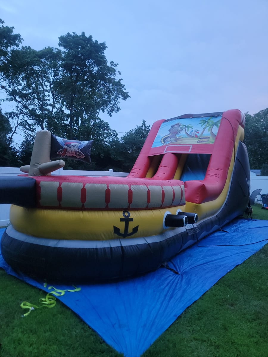 Ahoy, mateys! Get ready for an adventure like no other with our 18' Pirate Ship Themed Water Slide from Ralphs Rentals of Long Island! This incredible inflatable is perfect for thrill-seekers and pirate lovers of all ages. Whether you're hosting a birthday party, school event, summer bash, or community festival, this water slide will be the highlight of your event!
