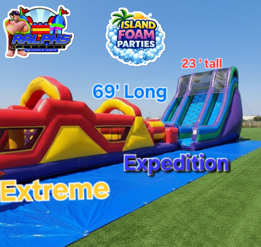 "Go big or go home! The Xtreme Expedition is the ultimate adrenaline rush for your next Long Island event. Standing a massive 23 feet tall and stretching 69 feet long, this powerhouse combo pairs our high-speed 34' Obstacle Course with the towering Summit Rush Jumbo Slide. With a wide 20' footprint, it’s a total game-changer for backyard birthdays, school field days, and community festivals from Shirley to Massapequa."